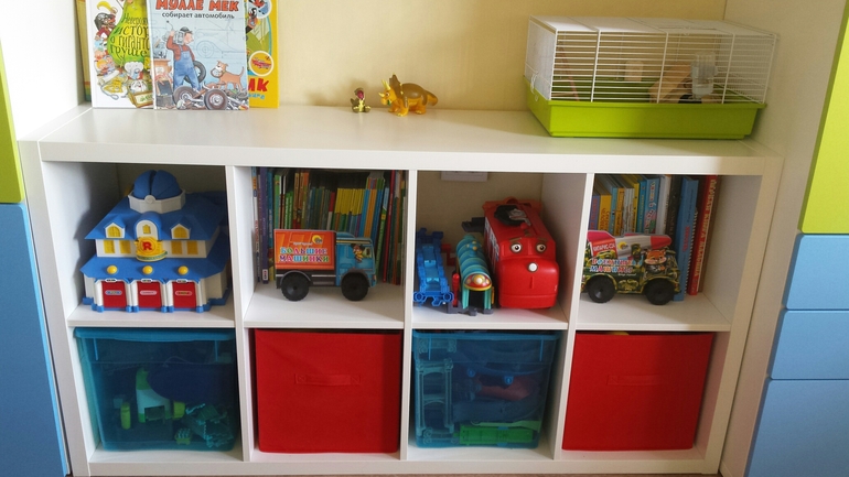 Стеллаж КАЛЛАКС стал местом хранения книг, моря пазлов, моря развивающих деревянных игрух. Также тут разместились 2 контейнера из Касторамы, они прямо идеально влезли в ячейки. В контейнерах хранятся наборы Чаггинтон и Поли Робокар. На полках разместились мойка и штаб-квартира Поли Робокар.