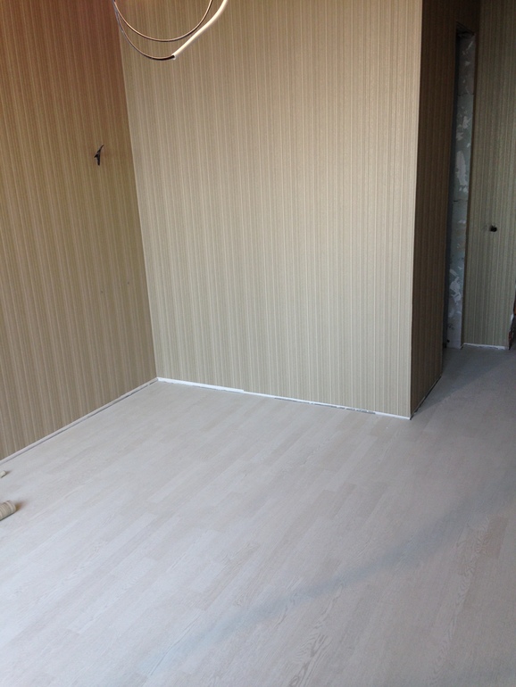 . В спальне и гардеробной уже положили паркетную доску и поклеили обои. Девочки от паркета я просто в восторге!!! Цвет на фото не совсем такой, в жизни он светло-серый тёплый оттенок с лёгкой текстурой.