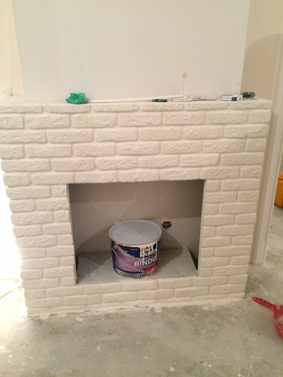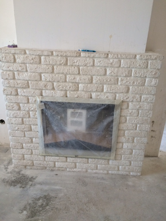 Делали рабочие наши по чертежу. Обкладывали камнем. Первый камин это натуральный неокрашенный камень из магазина. Решили лаком покрыть и спец.пропиткой, чтобы мылся, он стал с сине-зеленым оттенком и с глянцем. Ужас. Покрыли в итоге краской моющейся, не разбирать же. Получился вот такой как на втором фото. Менее фактурный, но более нарядный, на мой взгляд. Больше никакого лака. Лак был матовым, кстати, но блестел.