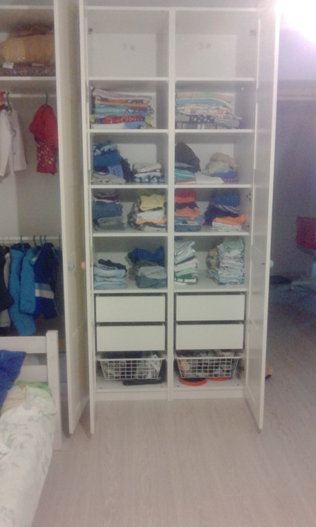 Моим примерно так же) У них один комод на двоих. По два ящика - для домашней одежды и для "приличной". Есть так же общесемейный шкаф, где вся не сезонная одежда и праздничные платья дочери))