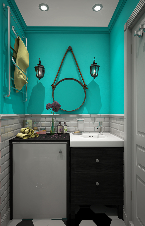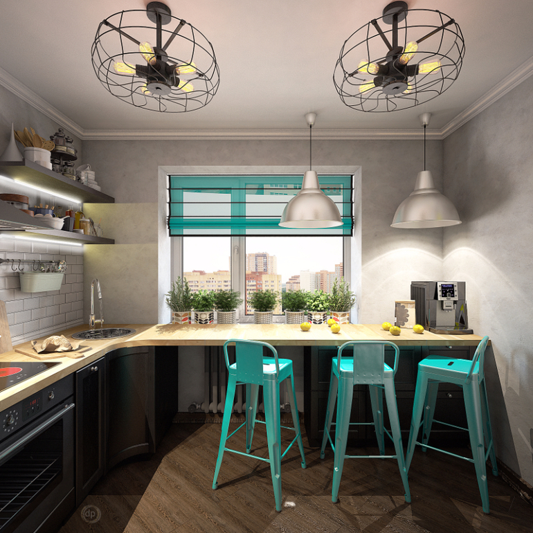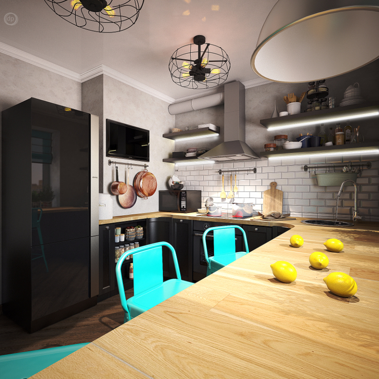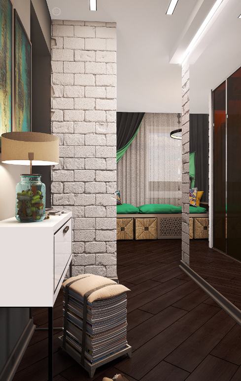 Из материалов акценты были сделаны на кирпич, а в цветовой гамме преобладали оттенки венге и бирюзы.
