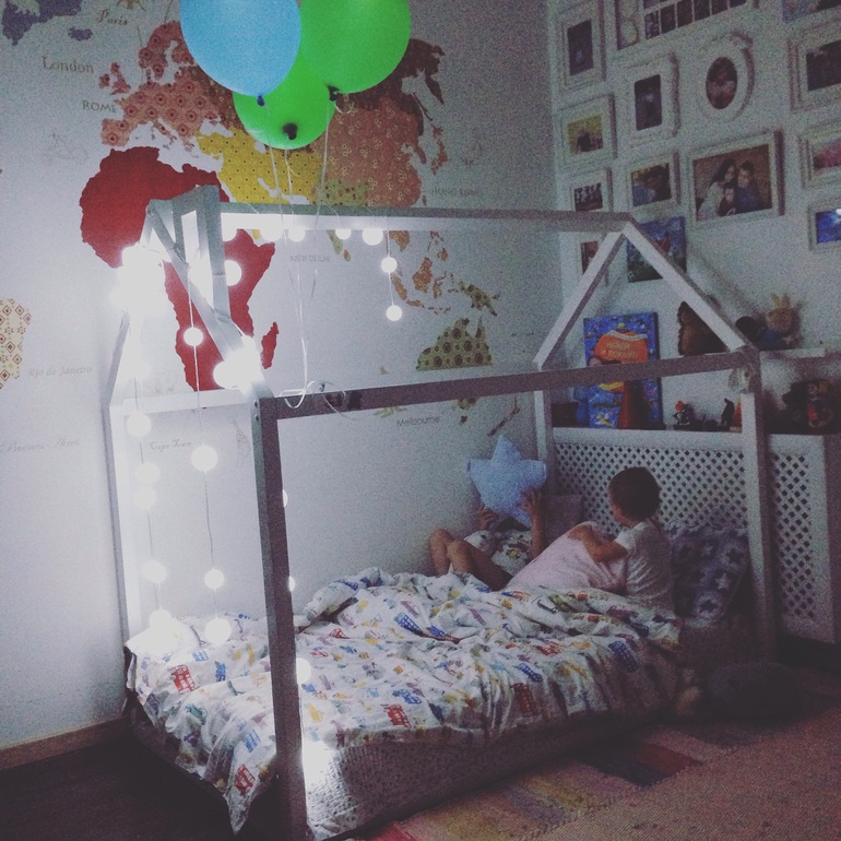 Домик на самом деле очегь нравится всем! Лучше его ставить к стене плотно, так удобней на мой взгляд. Ну так не совсем получилось. Размер дома 170 на 100, отличный размер доя детей. Матрас 20 см в высоту. Спать ни чуть не холодно, хотя в деьской балкон и двери в пол стеклянные, хоть он и утепленн зимой мы там не играем. Там кстати у нас место для чтениям пуфом и стоит стеллаж с игрушками, что бы не занимать место в самой детской. При каждой уборке не поднимаю , раз в неделю при сменне постельного белья. Белье не пачкается, утром мы его застелаем сразу. Домик заказывали на заказ, они кстати и с бортиками и на ножках делают тоже) но он достаточно высокий, если добавить году бкдет еще выше....