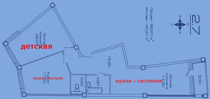Всем привет, вот наша квартира. Изначально мы её немного переделали и она стала у нас вот такой как на эскизе. Сделали небольшой ремонт, так как переехали сразу почти в черновую... постелили везде полы и от шпаклевали стены и переехали а потом делали потихонькудальше ремонт.