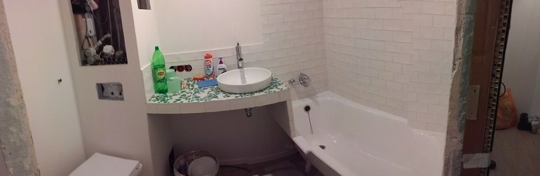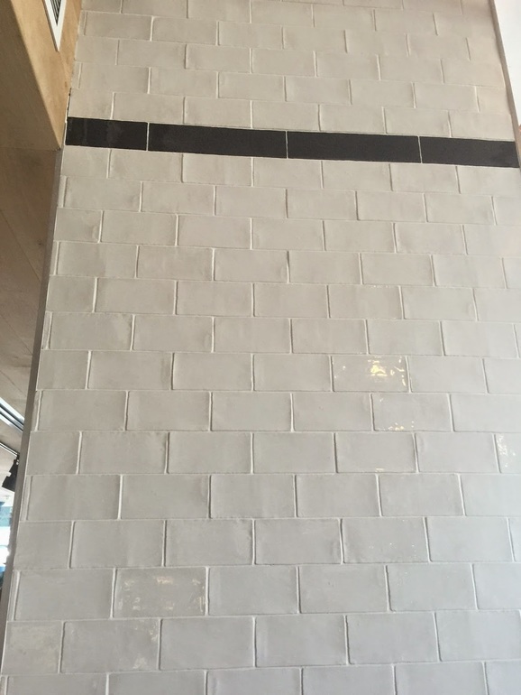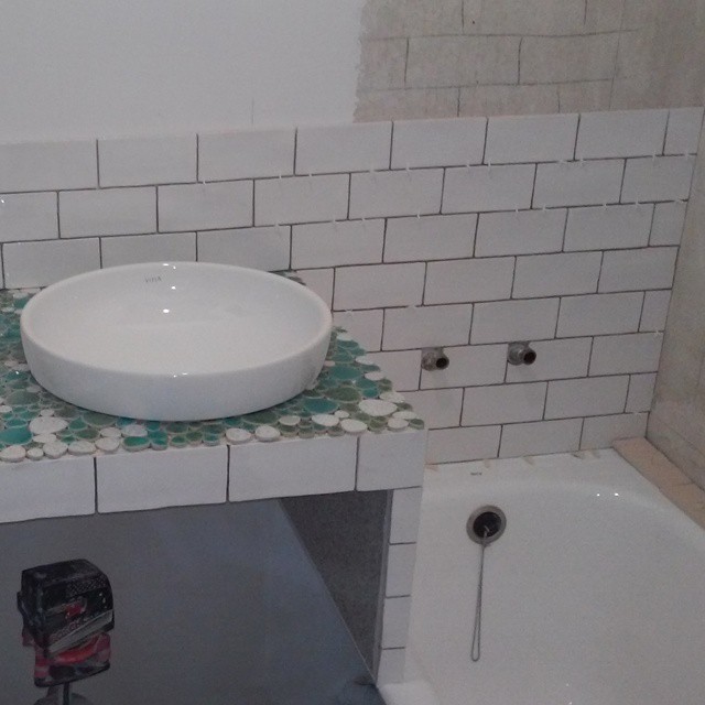На мой немой вопрос он ответил, что ну керамогранит (120*20см) он же клал с хаотичной разбежкой, почему же плитку-кирпичик (7,5*15) нельзя так же? Класть везде с половинной разбежкой ему оказалось.... тадаммм... НЕУДОБНО!! из-за сложной подрезки у смесителя!!