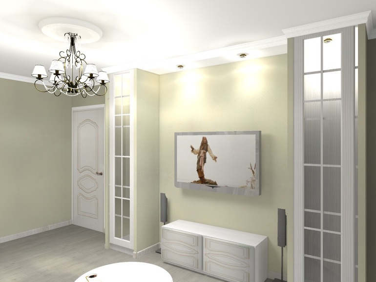Интерьерное решение гостинойИзначально планировали фактурную штукатурку или обои под покраску в гостиную, коридор и прихожую. Передумали, решили просто обои. По проекту все должно было быть в одном цвете, т.к. дверей между прихожей и гостиной нет, это единое пространство. Их отделяет маленькая перегородка только. Вот проект гостиной.