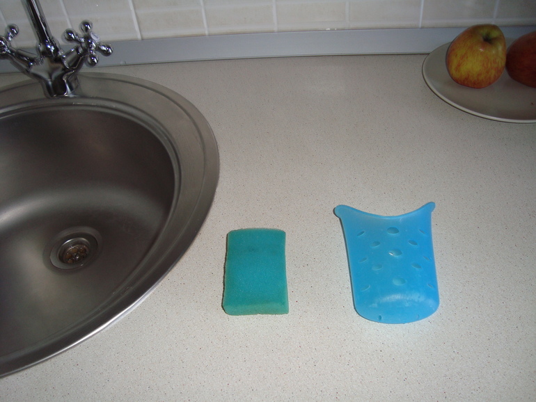 У меня ванночка с двойным дном, такая типа мыльницы, чтобы влага вниз стекала. Иначе губка лежит во влажной среде, бактерии множатся, ничего хорошего.