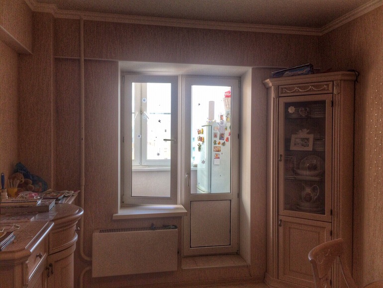 да, вам надо некрасивую батарею с трубами прикрыть, а то такая мебель красивая и кухня наверно красивая, а такой вид на окно все портит. Тюль не справится. Нужна именно портьера, как вам посоветовали, с одной стороны с подхватом и полупрозрачная тюль, чтоб холодильник на балконе не просвечивался сквозь нее.