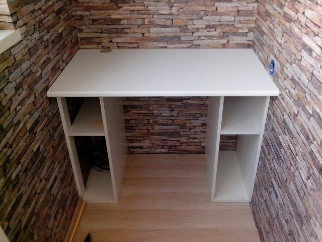 На присоединённом балконе кабинет. совсем недавно муж купил мебельнфй дсп и за несколько дней выпилил ком стол, шкафчики для книг и полочки для мелочей. Уже всё поставил, но пока без фасадов кабинет.