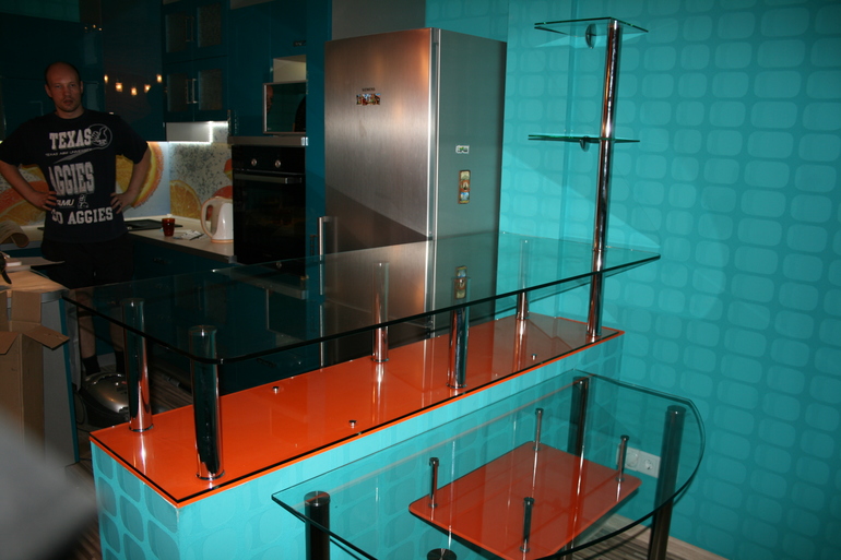 Ещё делает столы из стекла любой формы. Вот стол к этому же заказу: