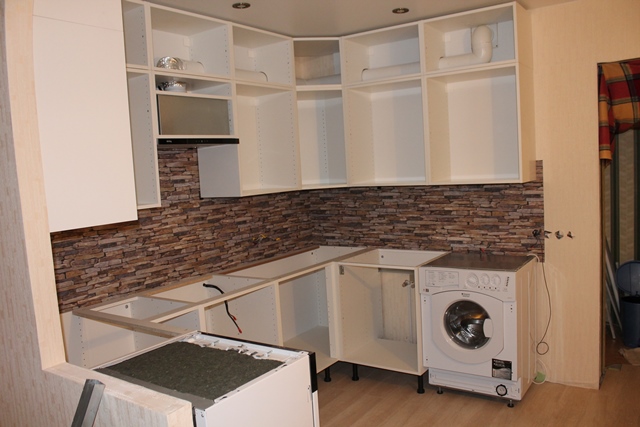 Столешницу тоже сами замерили, вместе с мужем поехали к другим оптовикам, выбрали под фартук фасады.