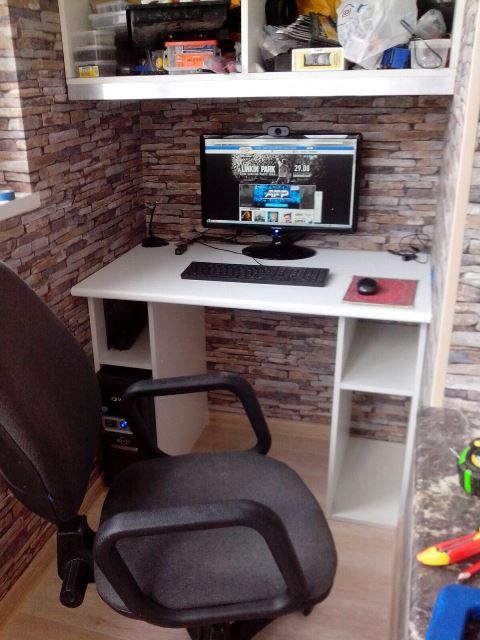 ))) Он недавно сам кабинет смастерил на балконе. Съездил в Бауцентр, купил мебельный дсп и выпилил за несколько дней мебель для кабинета : раб стол, навесные шкафы для книг и шкафчик для мелочей. Фасады ещё не заказали, но корпуса он уже установил.