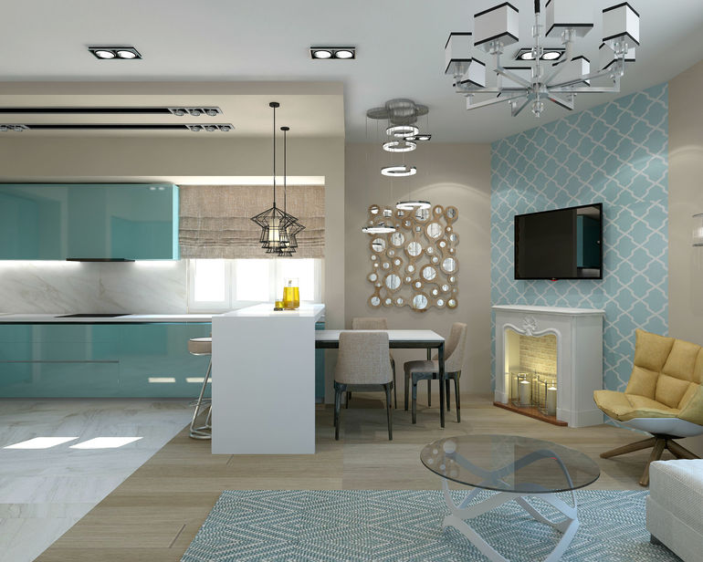 Точки над рабочей зоне, то есть на кухне. Затем над столом. А в гостиной все же нужно повесить люстру. Сейчас выбора очень много. И есть много вариантов, которые без шнура идут. У вас какой потолок?