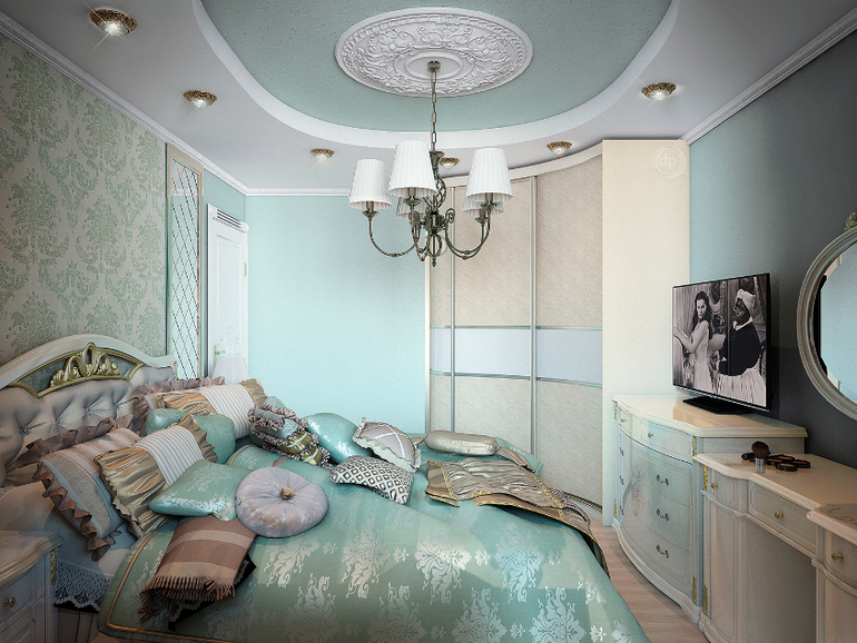 В спальне было решено использовать более холодную серо-зеленую цветовую гамму.