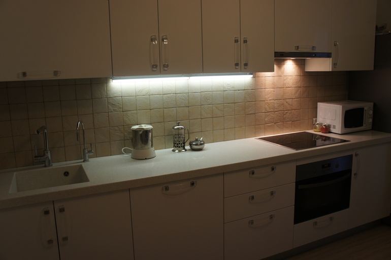 Купили на алиэкспресс светодиодную ленту и приклеили к низу верхних шкафчиков. Яркость регульруется пультом, да и выключать его с помощью пульта можно, но мы сделали отдельный выключатель возле основного.