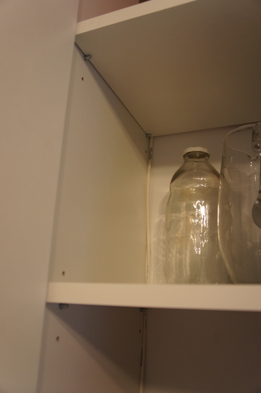 Сбоку в одном из навесных шкафов просверлена дырочка для провода, идет внутри шкафа по углу наверх, где стоит двойная розетка - вытяжка и свет.