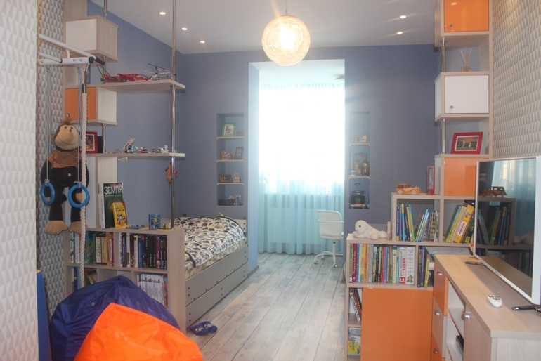 В квартире высокие потолки и возводить сложные конструкции не хотелось.Плюс комната планировалась на вырост,поэтому остановились на сине-белой гамме с добавлением ярких деталей.Чтобы в любой момент можно было заменить декор и текстиль, когда изменятся предпочтения мальчиков.У ребят есть своя гардеробная комната, поэтому удалось избежать загромождения шкафами и осталось много места для игровой зоны.