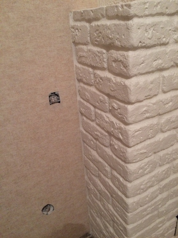 Ох, на фото не очень выглядит. Вот поэтому я сначала обои клеила, а потом кирпич ложила.