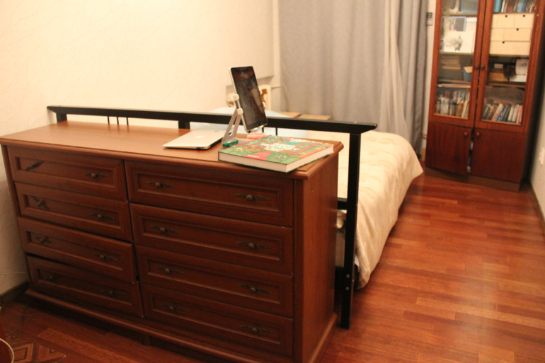 задумка хорошая, не жалейте изголовье кровати, я б спилила его до уровня каркаса на ножках, и сделала бы сама мягкое изголовье, в интернете полно уроков, как это сделать. А еще есть бюджетный вариант, прикрепить рейлинг к комоду, если у вас задняя стенка комода прилично выглядит, вот примерно как на фото.