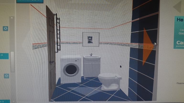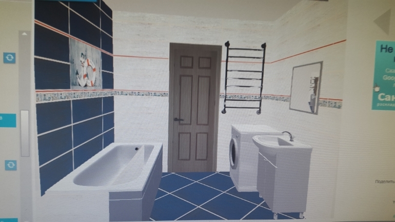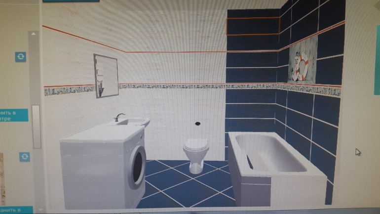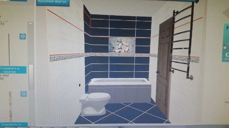 Делала на сайте: http://3dplitka.ru/. В магазине выбрали плитку, а потом нашла ее на сайте, там большой ассортимент. Только сохранить результат не получается, сайт предлагает купить, и тогда можно сохранить. Я сняла на телефон. Но наверняка таких программ много, я просто стала пробовать в первой попавшейся.