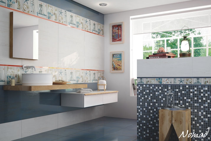 Интерьерное решение ванной комнатыДевочки прошу совета по выбору плитки для ванной. Как вам такой вариант? Я сомневаюсь, так как предпочитаю светлые оттенки в интерьере, но муж категорически против бежевой ванной. Хочет по ярче. Производство Испания, фабрика Rocersa, коллекция Nomad. Раскладку делала сама, размеры примерные. Потом в салоне сделаем поточнее. Фото ниже...
