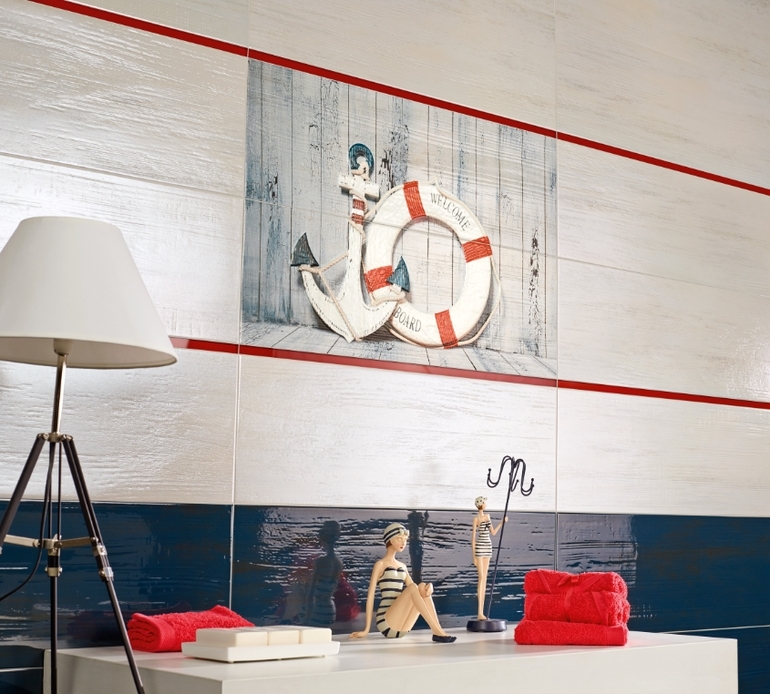 Мы такой плиткой выложили гостевой туалет. Тоже белые с красным бордюром стены и синий пол. Мне очень нравится, хотя в процессе укладки я засомневалась, что получится чересчур ярко и броско, в итоге получилось шикарно. Настенная плитка-супер, как доски непрокрашенные, и кстати, панно и бордюры не выглядят по-цыгански пестрыми, все в стиле. Но у нас весь первый этаж с намеком на морскую тематику, поэтому туалет только подчеркивает задумку.