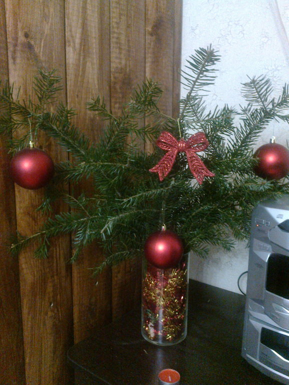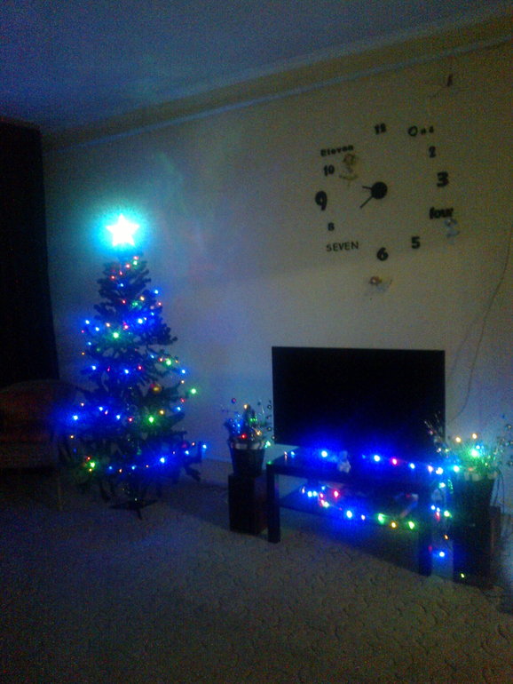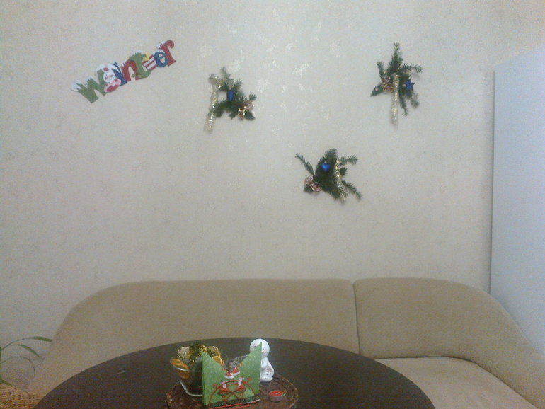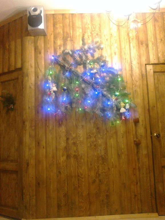 Лампочки, вешаю перебор игрушек на стены, "дождик" туда же. Ёлка, естественно. "снежинки" из бумаги делаем.))