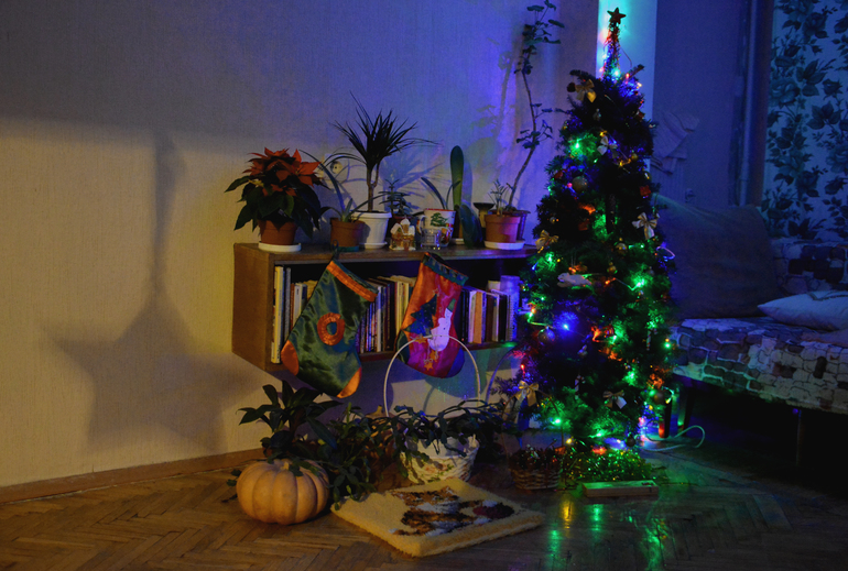 Оооо эта самая любимая моя тема: украшение квартиры к Новому году)))) В том году было ужасно много желаний и идей как украсить квартиру, именно сделать украшения своими руками, но как-то руки не дошли, просто повесили гирлянды на окна, нарядили елку, налепили всякие растяжки из магазина к новому году и все) Единственное, что сделала сама - это елку из ткани на кухню)