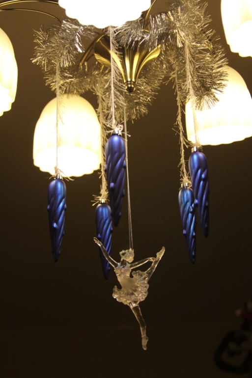 Еще к потолку удалось прикрепить белые небьющиеся шары и сосульки в хаотичном порядке и на разных уровнях, тоже белые. Эффект замечательный! Есть варианты с балеринами, облачками из ваты и снежинками, но игрушки смотрятся аккуратнее, на мой взгляд)