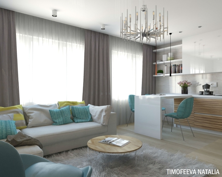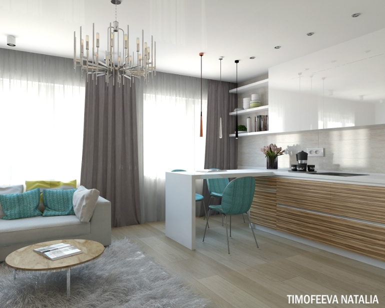 Мне очень понравилось, особенно дерево на стене ( это паркет или ламинат) и декор бирюза ( шторы, подушки, стулья