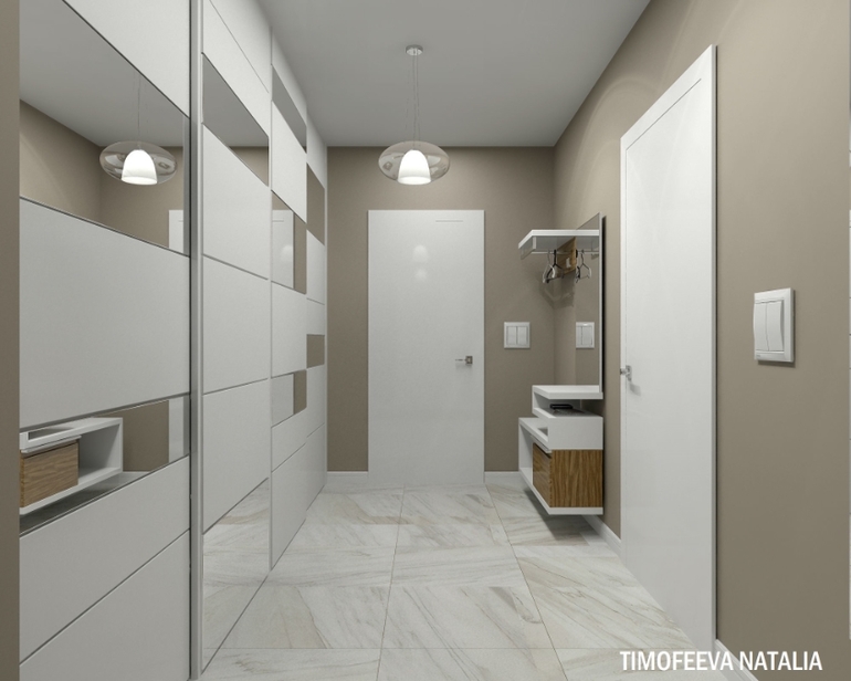 Спасибо) коридор окрашен в шоколадный цвет, напротив шкаф купе глянцевый с зеркальными вставками.