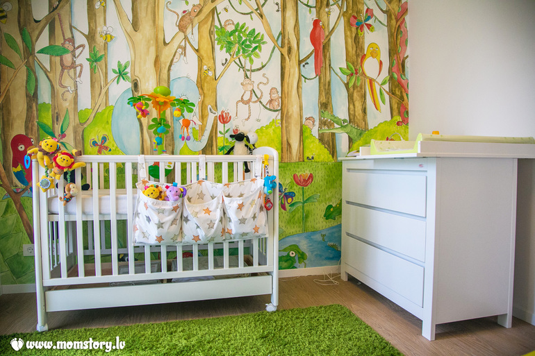 Так как перед самым началом ремонта мы узнали, что деток будет двое и непонятно какого пола, то было принято решение что первое время детки будут обитать в одной комнате, а после того как надо будет менять кроватку, одного переселим в кабинет. Дизайн должен быть универсальным. Т.е. не слишком девчачий и не слишком пацанский и в то же время яркий. Так как розовый и синий отпадают, то за яркость будут отвечать зелёный и жёлтый, а с чем у нас ассоциируются эти цвета? Всё верно! ДЖУНГЛИ!