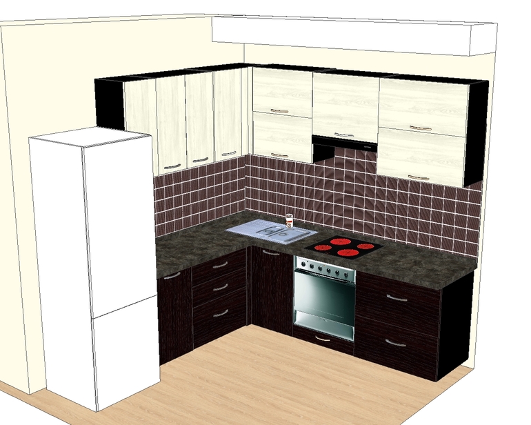 Ой,у друга ну оооч похоже. Только ещё меньше. Холодильник как раз за перегородкой,далее раковина,угол -поверхность пустая,далее варочная и у окна тож поверхность пустая. Микровэ на окне