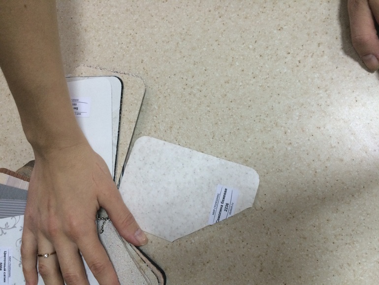 Я так поняла у вас полы, стены - все бежевое. Фасады и столешку хотите тоже бежевую - это прям все будет однотонное и получиться не очень красиво))