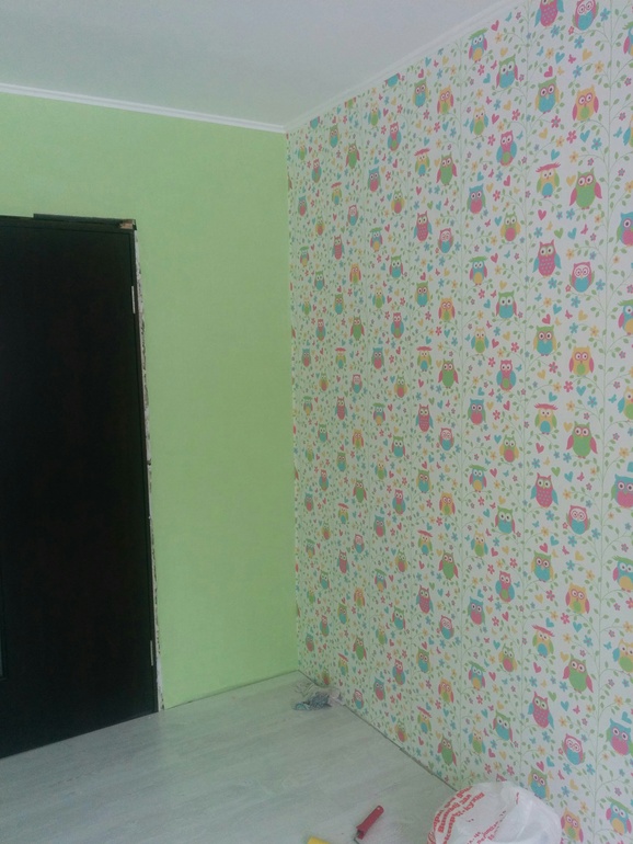 одна стена с совушами, а остальные зеленые. мебель вся будет белая, Бортики в кроватку розовые.