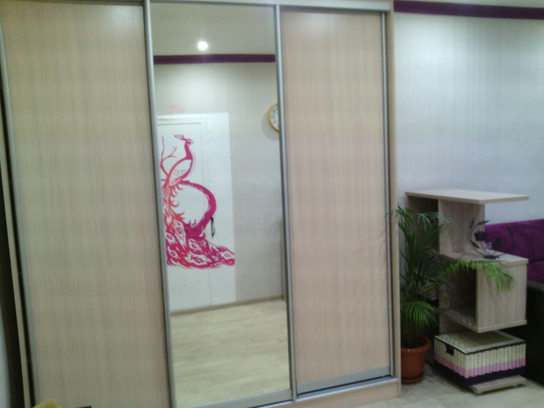 В зеркале отражается печка с павлином.