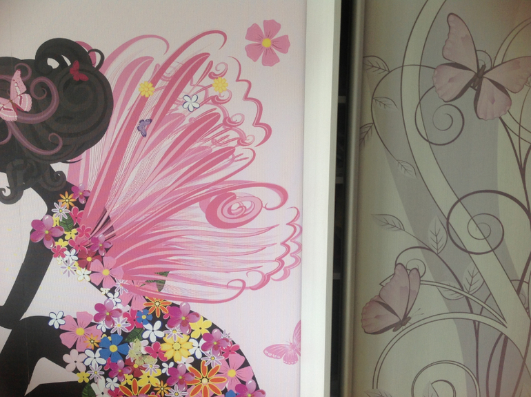 есть фотообои розового цвета цветы, бабочки девочка. Основные обои белые с серым блеском.