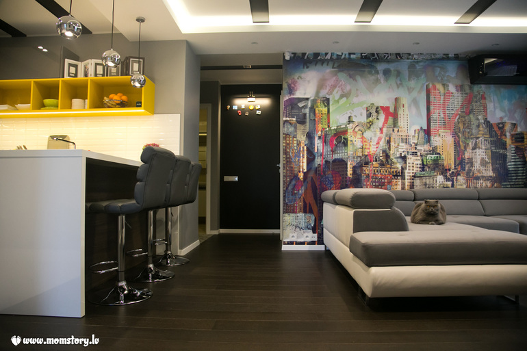 Большая часть стен покрашена в средне серый, который с лёгкостью можно разбавлять любыми яркими акцентами. Как раз это мы и сделали наклеив на одну из стен яркие шведские обои с изображённым на них граффити городом. Охх как же мне полюбились эти обои. В дали чёрная стеночка в коридоре ни что иное как грифельная магнитная доска, которую мы пока ещё не успели изрисовать мелками.