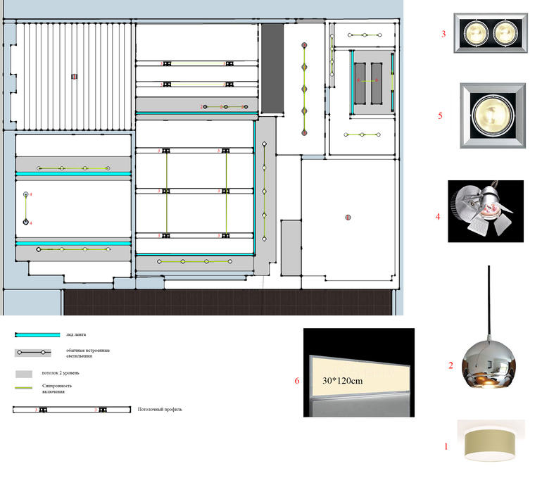 По периметру потолка идёт многоуровневый потолок, со всторенными светильниками и скрытой лед подсветкой, который разделяет кухонную и гостиную зону. Потолок на зоны разделяют гипсокартонные чёрные полосы в них встроены двойные спотовые светильники, которые могут менять угол освещения. Так же над островом установлены три хромированных светильника на диммере, которые освещают зону трапезы.