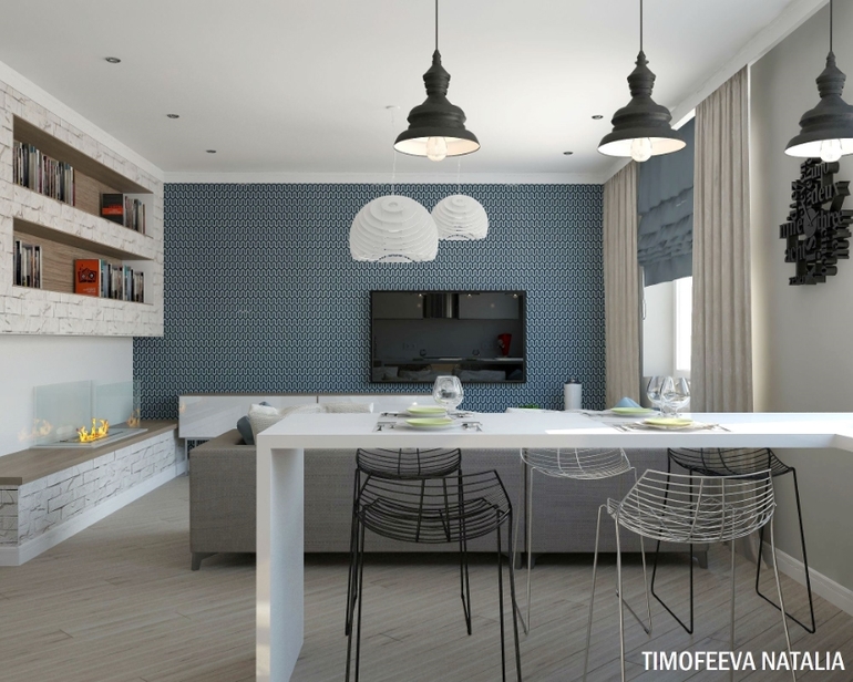 В процессе работы были учтены все пожелания заказчика. Была сделана перепланировка с целью объединить кухню и гостиную. От обеденного стола отказались в пользу барной стойки, которая делит комнату на две зоны. В отделке были использованы не дорогие отделочные материалы с целью экономии бюджета. Интерьер получился достаточно простои и легкий. Функциональный и идеально созданный для жизни молодой семьи.