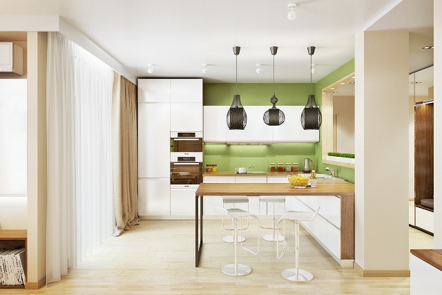 Если точно этот проект, то я бы убрала ящики над барной стойкой и железную трубу, над барной стойкой повесила бы 2-3 светильника на длинных основаниях?в потолок, и барную стойку сделала бы целым основанием со шкафами внутри со стороны кухни.