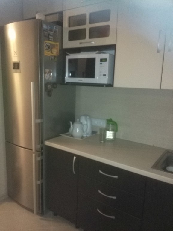 Еще не все мебель установили, т.к покупаем все по немного, стену между кухней и большой комнатой снесли. Дверцы нижние покупали в кастораме по распродаже, оливкового цвета, у нас еще в леруа продавали по 300 рублей нижние шкафы без дверц, верхний ярус весь на заказ, шкаф под холодильник в икеи брали по распродаже, верхние дверцы для холодильника тоже под заказ. "Холодильник" под окном разобрали, и провели воду и слив под окно, слив под большим углом, поэтому все нормально сливается.