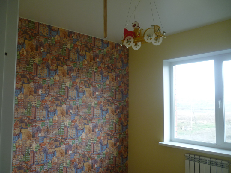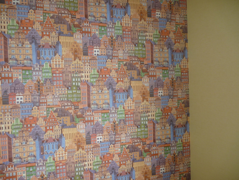 Вполне сочетаемые цвета. А если вы наклеите обои, которые на фото ниже, то будет перебор с домами и цветом. У вас в данный момент диван с подушками яркий элемент и он будет притягивать взгляд. Лучше взять обои песочного цвета и близкие к однотонной расцветке. Шторки светло-салатового либо светло-желтые.