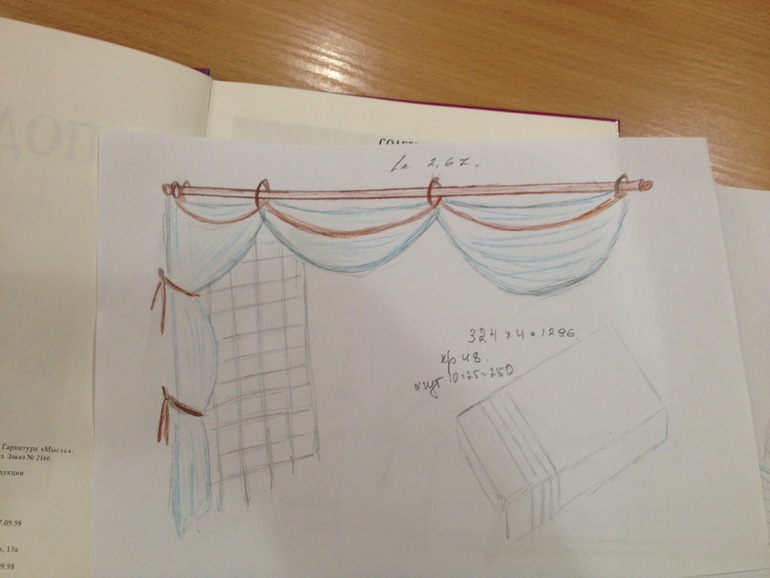 Мне предложили справа от шкафа пустить лен белый, перевязывая веревкой , будет идти вдоль карниза, немного напуск на окно будет, а слева, где корабль стоит черный , будет этот лен спускаться до стола, подхвачен к левой стене , и пустит сеть еще немного. Сеть цвета натуральной сети. Карниз в цвет фурнитуры, античная бронза .