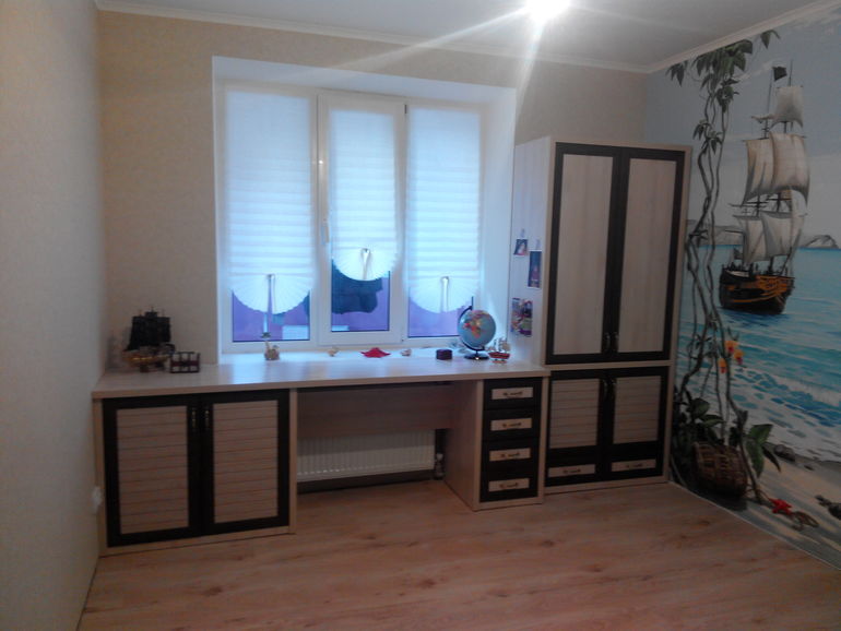 В комнате сделан ремонт. Ребенку 6. Стены две песочные, две с рисунком. Кровать будет под стеной с морем, цвет такой, как и вся мебель +- оттенок будет другой.