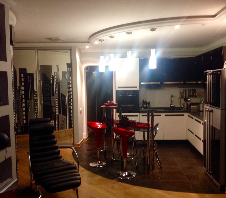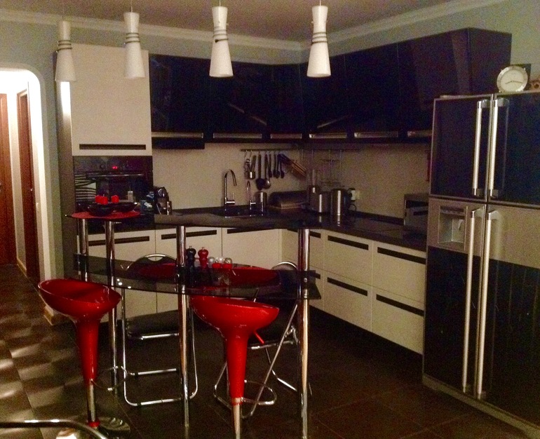 Первое - черно-белые фасады. У подруги именно так, но мечтает уже переделать, т.к. стала "рабой трапки". На черных фасадах видны абсолютно все отпечатки.