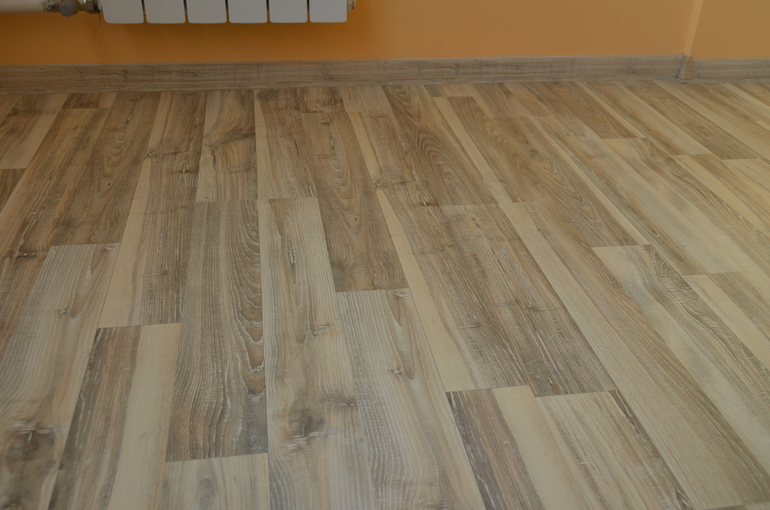 В комнатах и коридоре у нас ламинат обычный-венге, на кухне -пробковый-в коричневых тонах)
