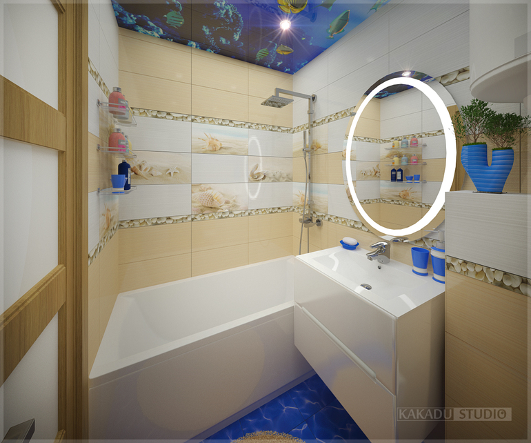 Потолок белый, пол в виде камушек надо подобрать что та. И вот с декором на стенах перебор, выберите одну ракушку и сделайте ее по середине, а остальное уберите, сделайте акцент.