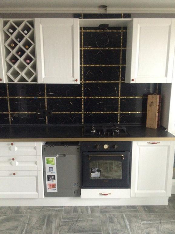 Я точно знала что хочу яркую броскую кухню, поэтому когда на распродаже увидела черную плитку коллекции "Версаль" купила ее на фартук(у нас тогда еще даже не сдана была квартира))) в дальнейшем мы купили золотую мозаику и дополнили ею фартук. Так же я точно знала,что хочу серые стены, идеальные обои искались в течении месяцев...