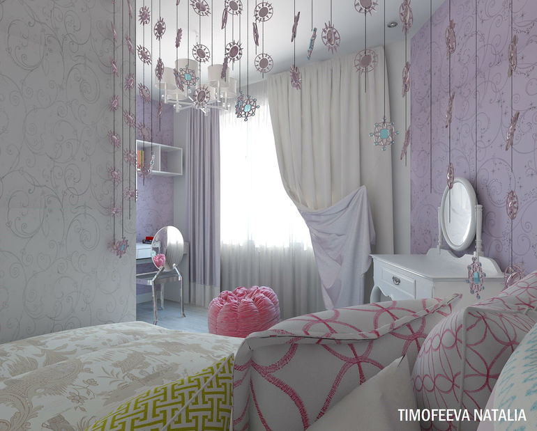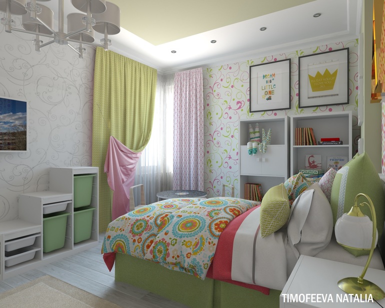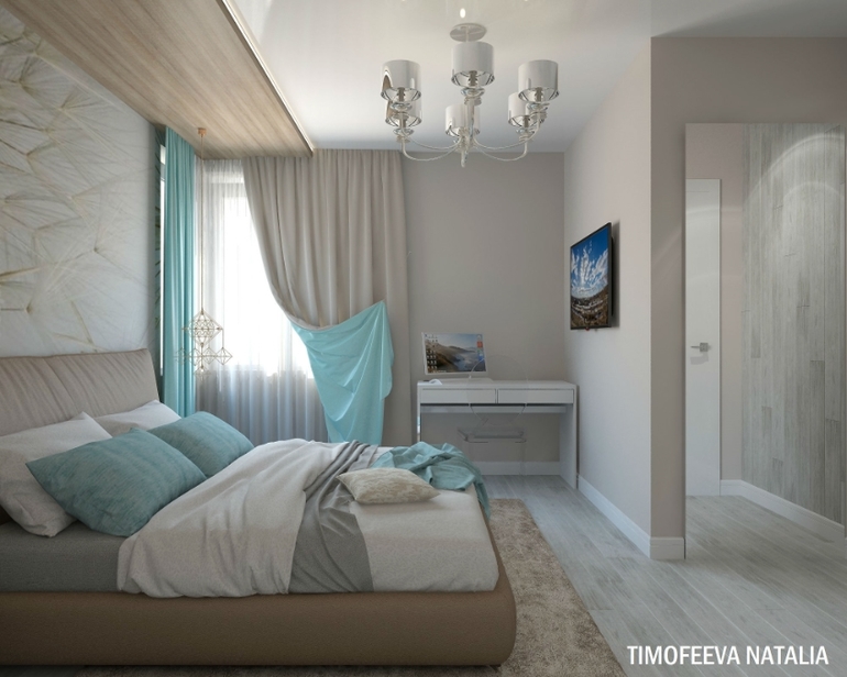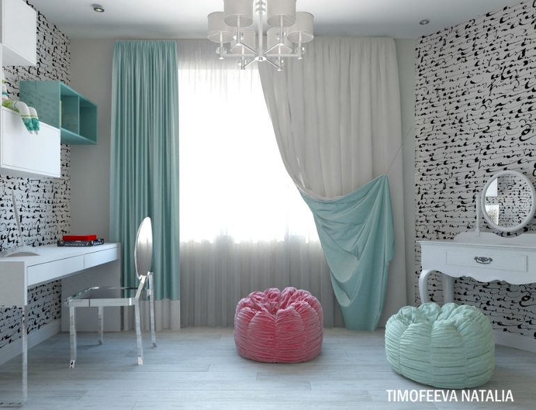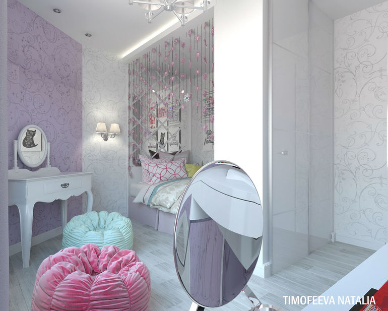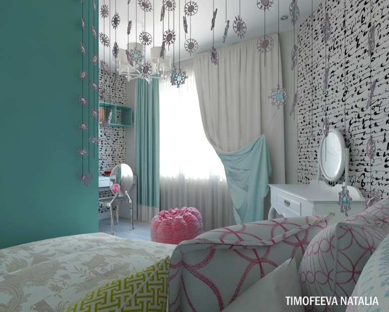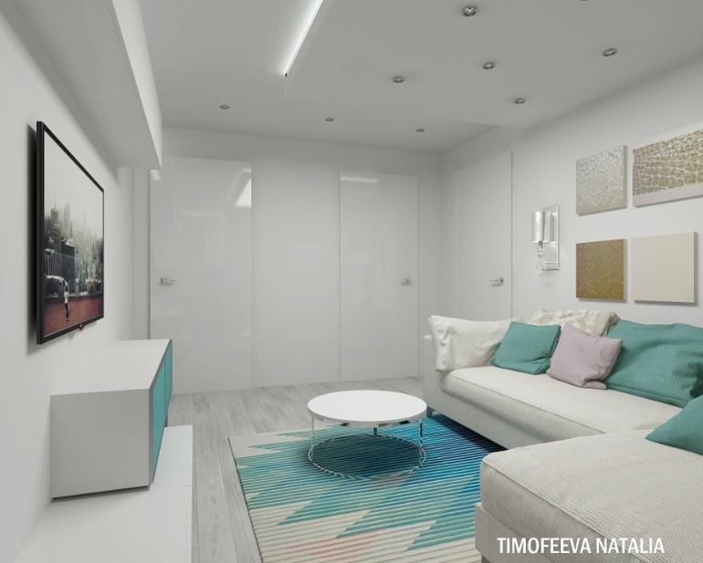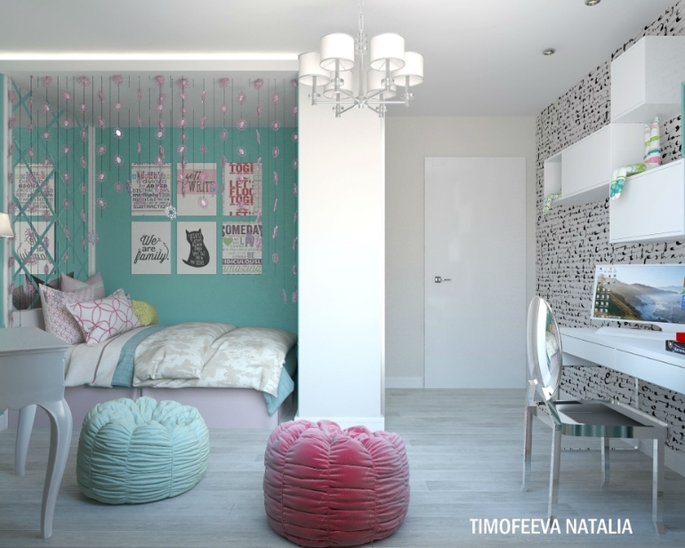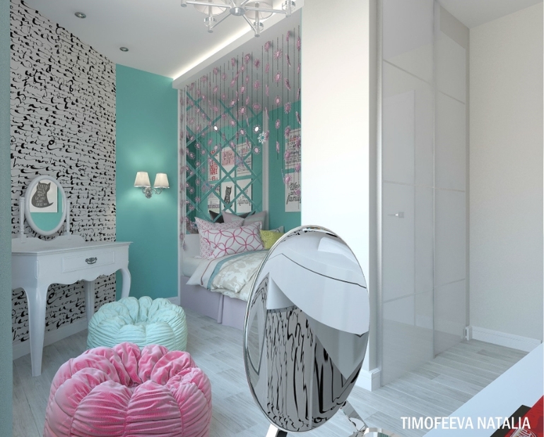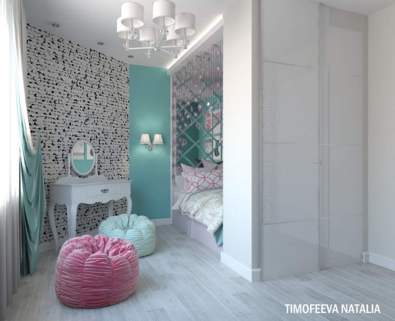 Квартира площадью 90 кв.м. Интерьер для папы, мамы и двух сестренок. Для того чтобы у каждого члена семьи была своя комната, мы разделили гостиную на две части, в результате чего получили еще одну детскую комнату, вторую часть комнаты объединили с коридором и организовали гостиную зону. Сан узел разделили на два, один для спальной комнаты, второй общий. Дизайн был разработан в 2 вариантах, в оттенках бирюзы и сиреневом цвете...