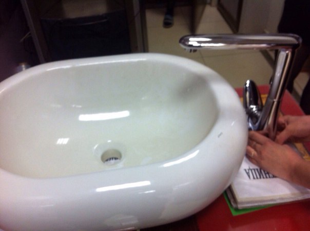 Мы не особо искали до того момента подобные раковины, просто так случилось, что она полностью нам подходила по внешнему виду : белая, овальная, большая. В связи с финансовыми трудностями вопрос о покупке тумбы или отдельной столешницы каждый раз откладывался. Но внезапно появилась возможность халявы, и мы заказали у знакомого тумбу из обычного дсп, обклеенного чем-то бело-глянцевым ( всё как и хотели), только за качество отвечать никто не брался. Внимание вопрос! Мы понятия не имеем, долго ли нам прослужит подобная сомнительная конструкция под нашу раковину, тк никакой столешницы она не имеет, а каменную столешку заказывать в данный момент нет возможности. Да и к тому же мы из-за нашей чудной раковину столкнулись еще и с проблемой покупки смесителя. нам всё "мало". Может у кого стоит что-то подобное? Подскажите и покажите пожалуйста.